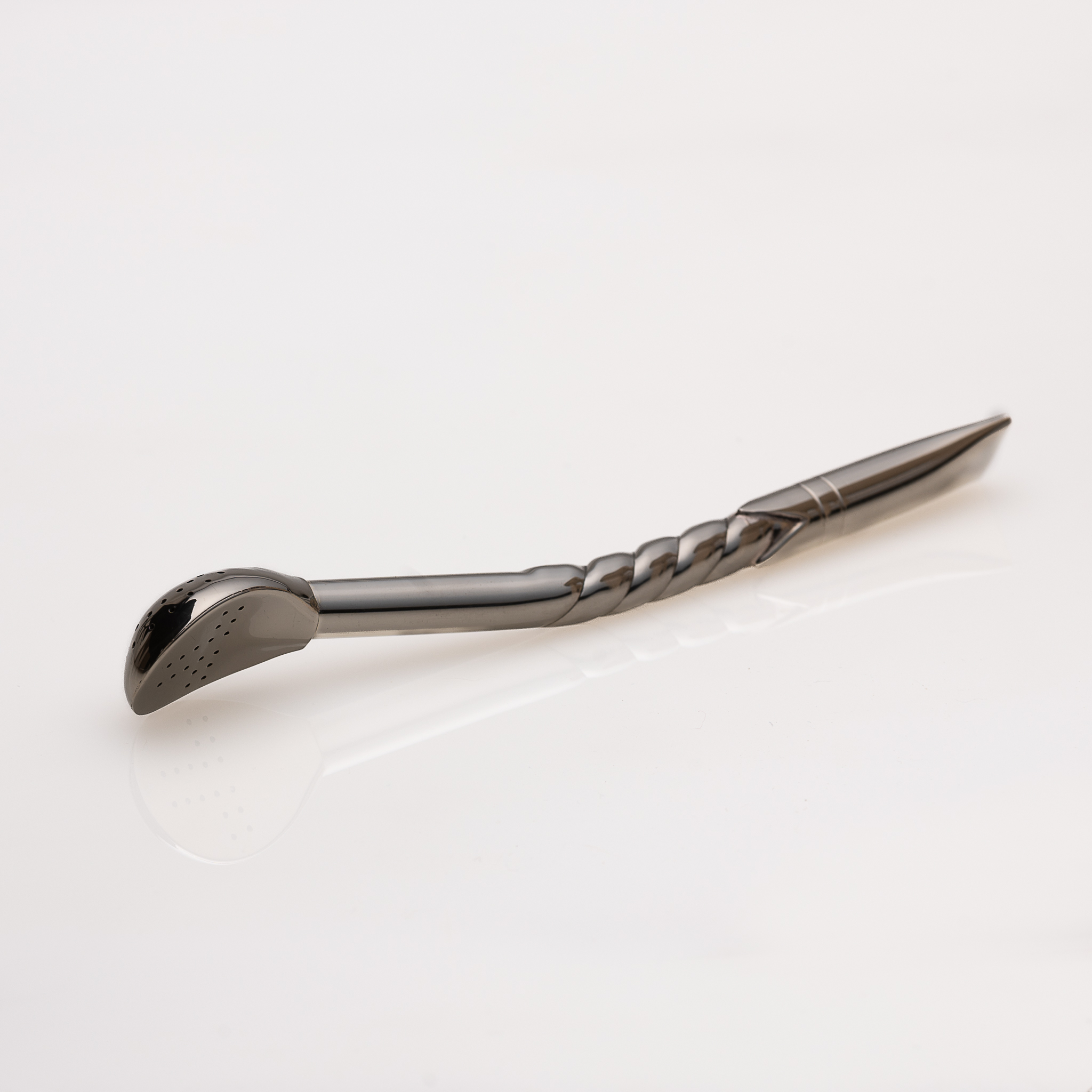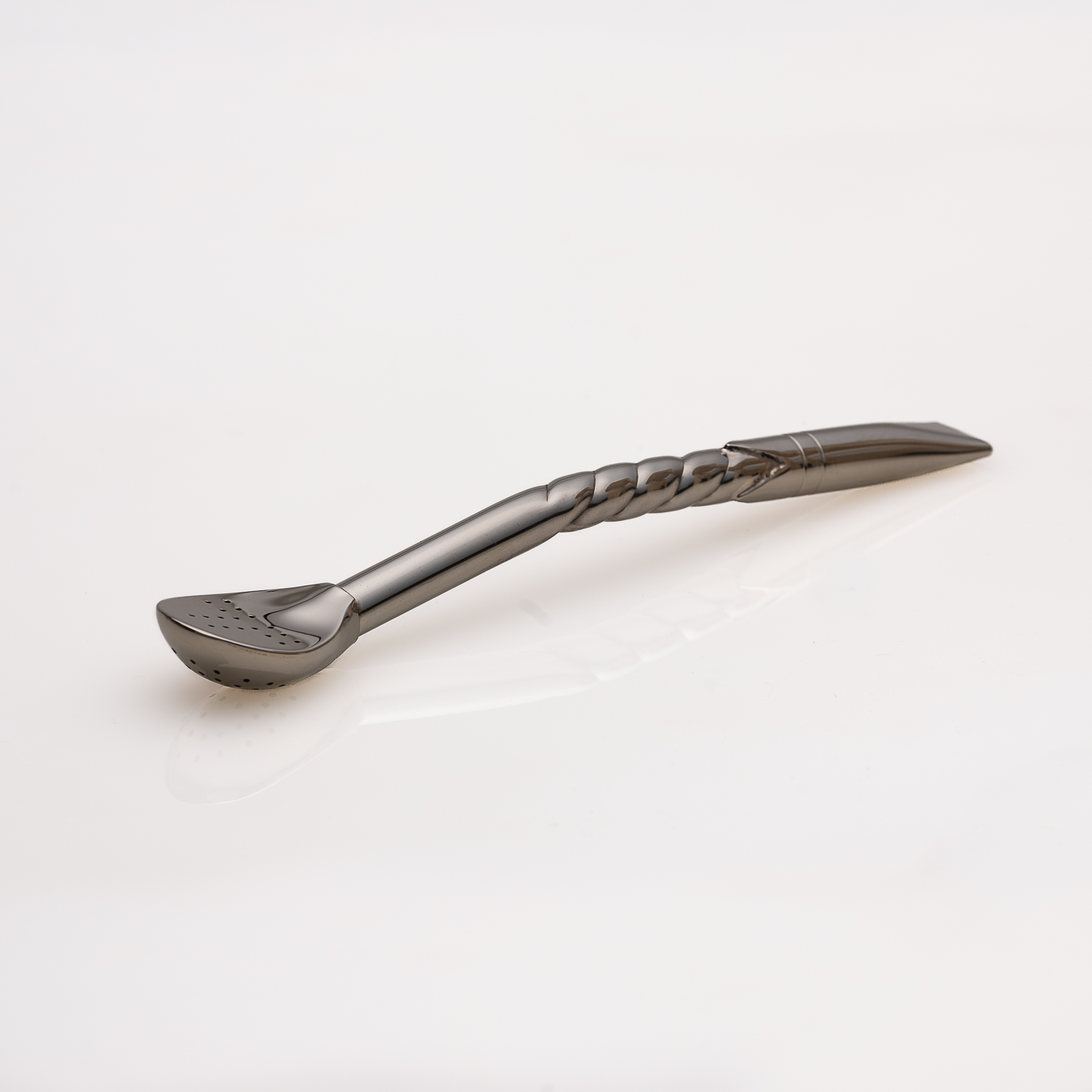 CARACTERÍSTICAS: Bombillón artesanal de alpaca con cincelado espiral simple con pico rey recto.