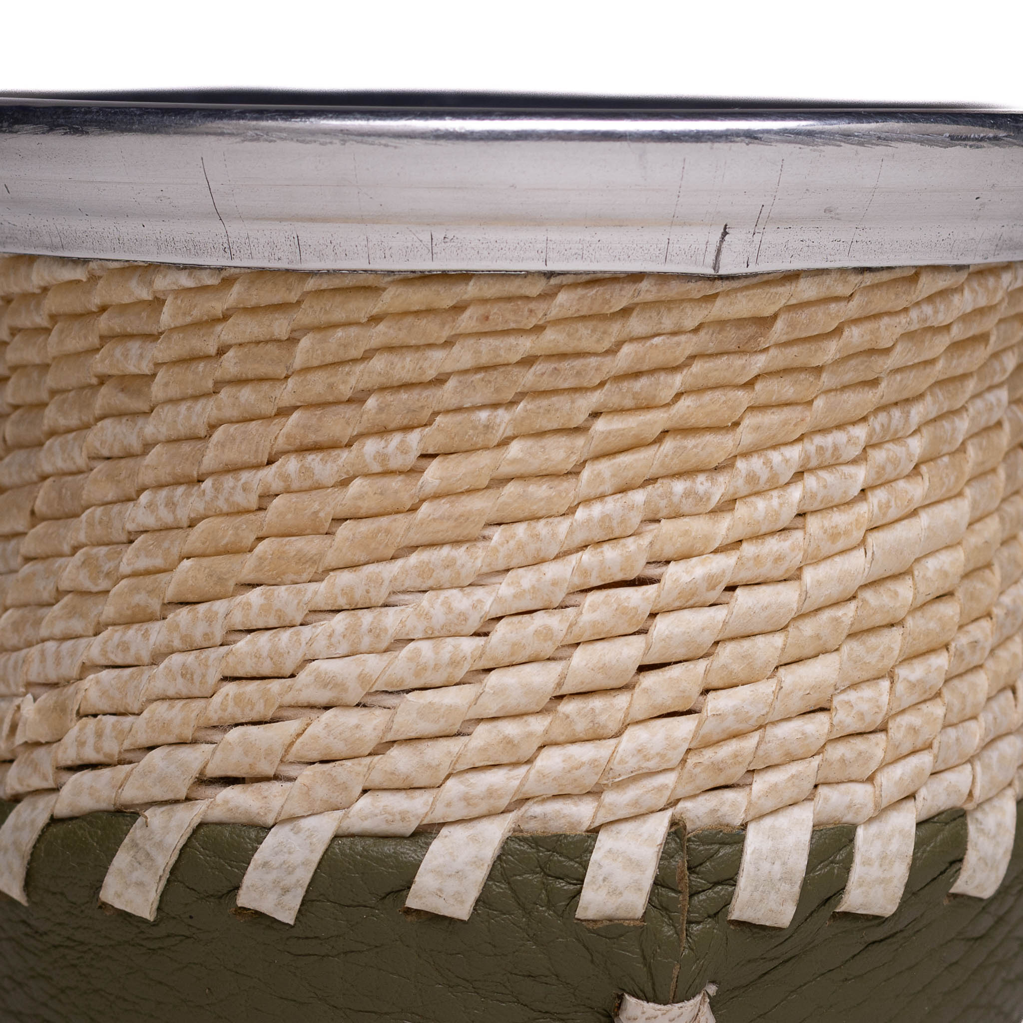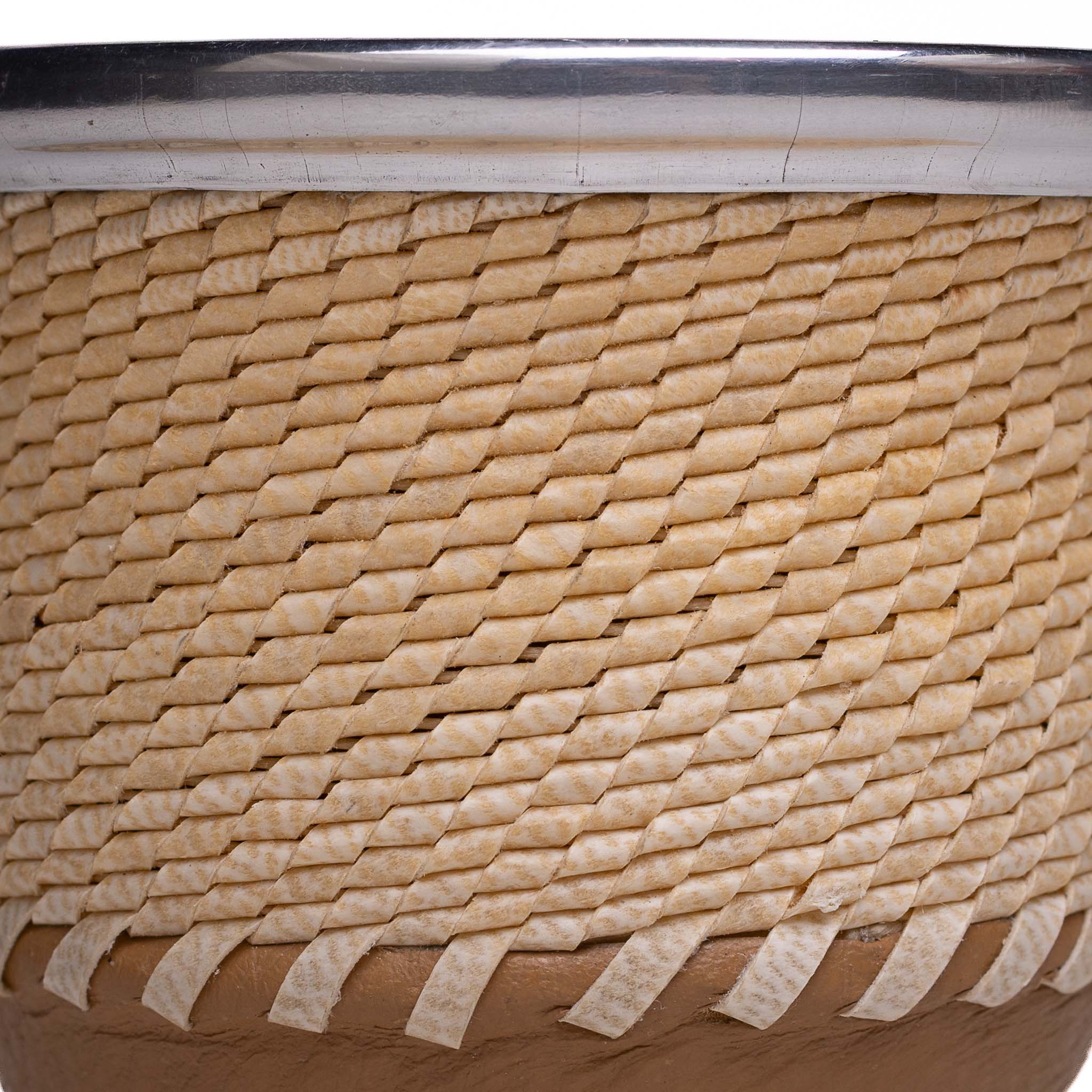 CARACTERÍSTICAS: Mate modelo bocón trenzado con base. calabaza cosecha misiones o brasil, cuero de abajo tipo floater, también llamado graneado. virola de alumnio. El trenzado es con tientos de cuero crudo.