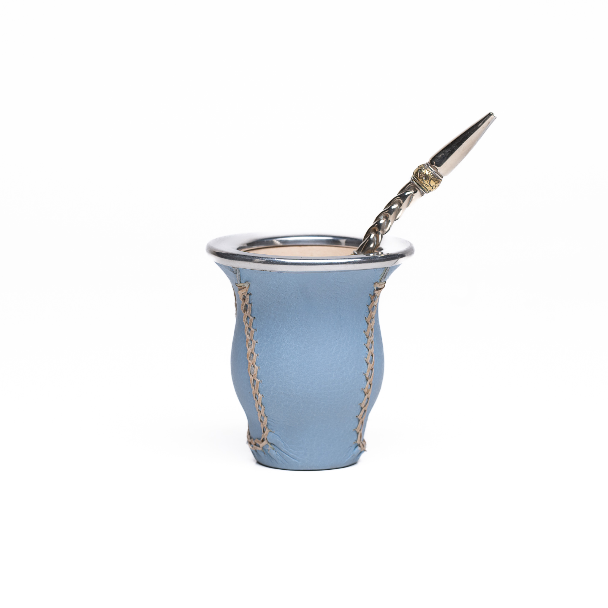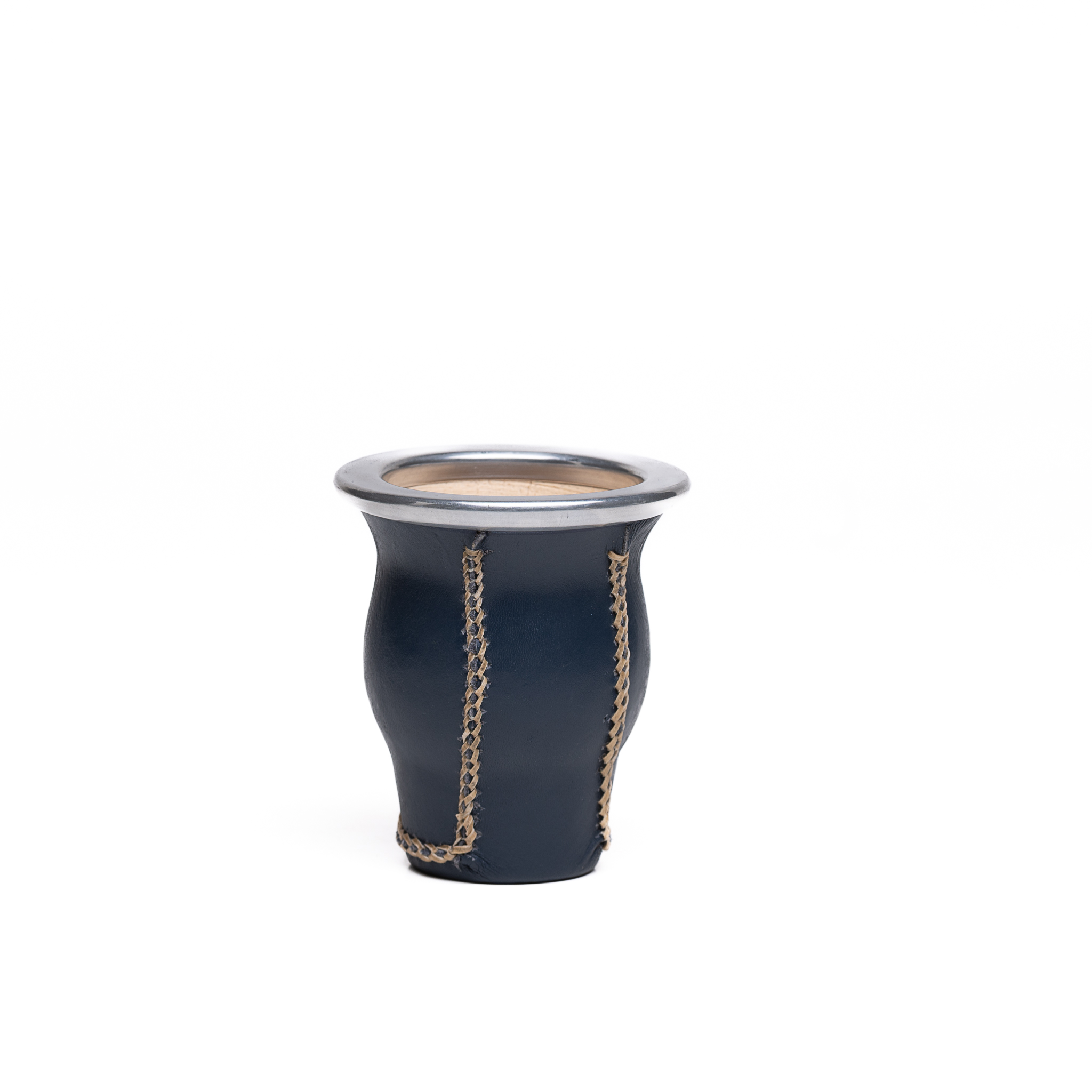 CARACTERÍSTICAS: Mate de calabaza estilo camionero con base forrado con cuero vaqueta curtido. virola de aluminio. Costura vertical trenzada a mano.