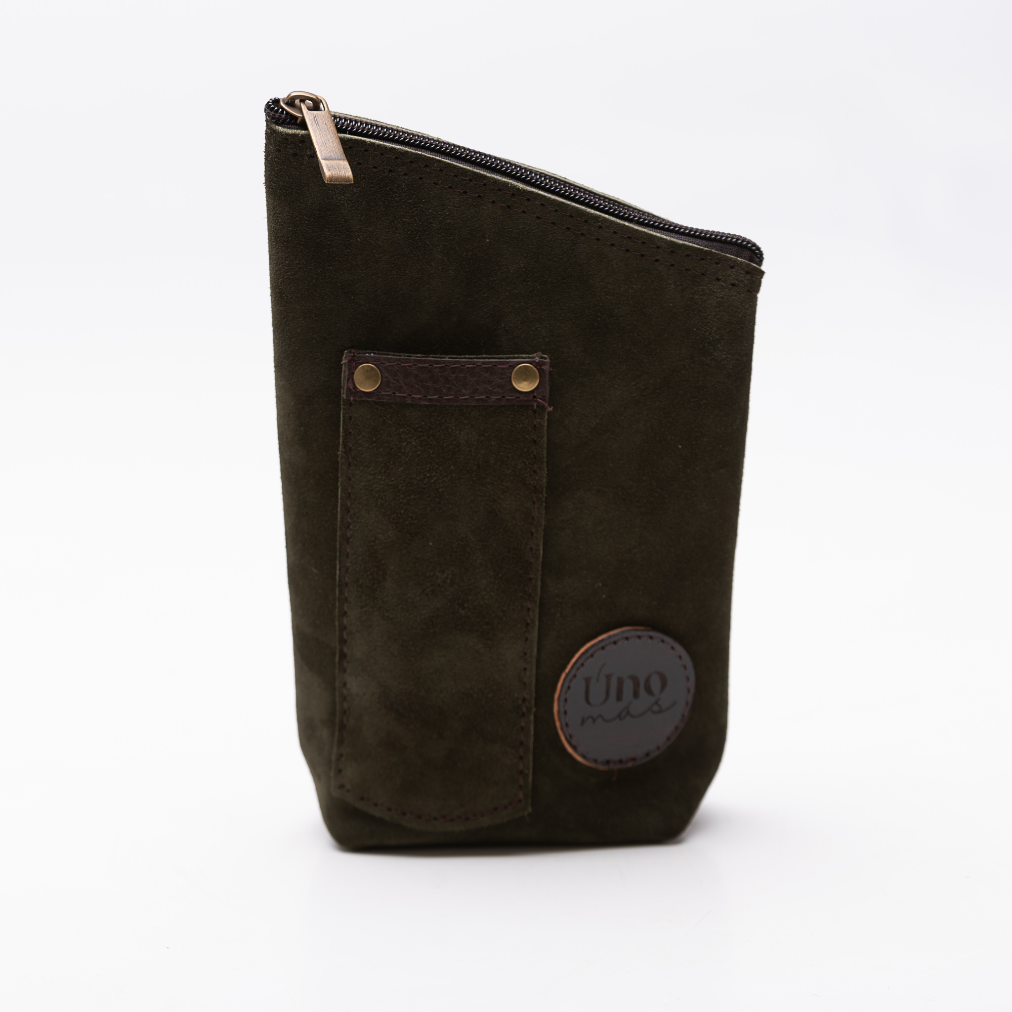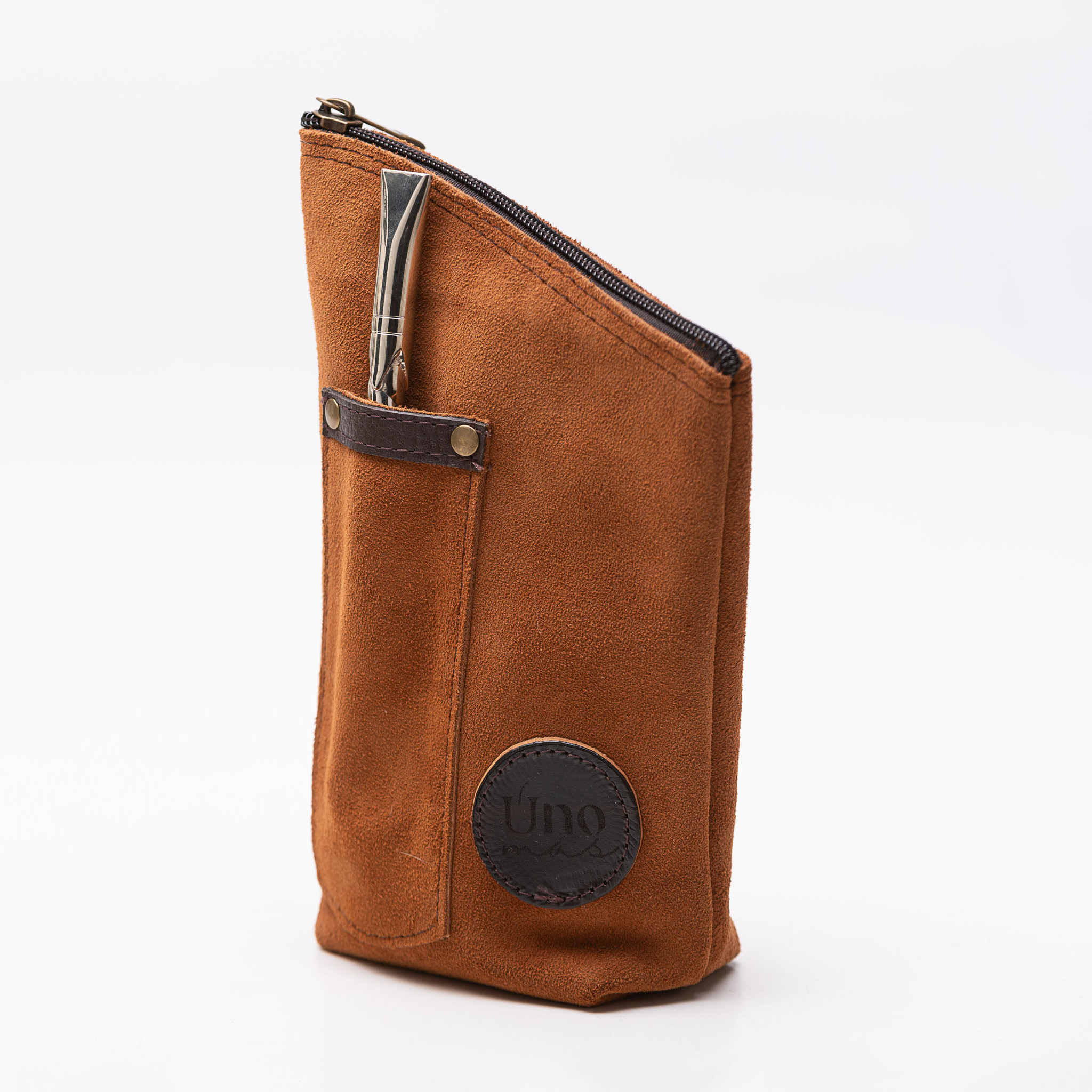 Yerbero mediano de gamuza con bolsillo para bombilla y fuelle de 4cm. herrajes en metal bronce viejo.